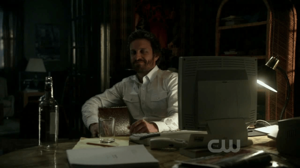 On a metareferential level, the fact that Chuck’s voiceover continues after he finishes typing, suggests that Chuck is not only the narrator and author of the Supernatural books in the show’s storyworld, but also of the show itself. In that way, he acts as a direct mouthpiece of the show’s creator, Eric Kripke, calling attention to the show as show. The tensions, then, between free will and determinism stretch beyond the diegesis and into the realm of the show’s own construction, and we are called to ask, what freedom do we the audience have over the narrative once it’s over and the “book” is closed?