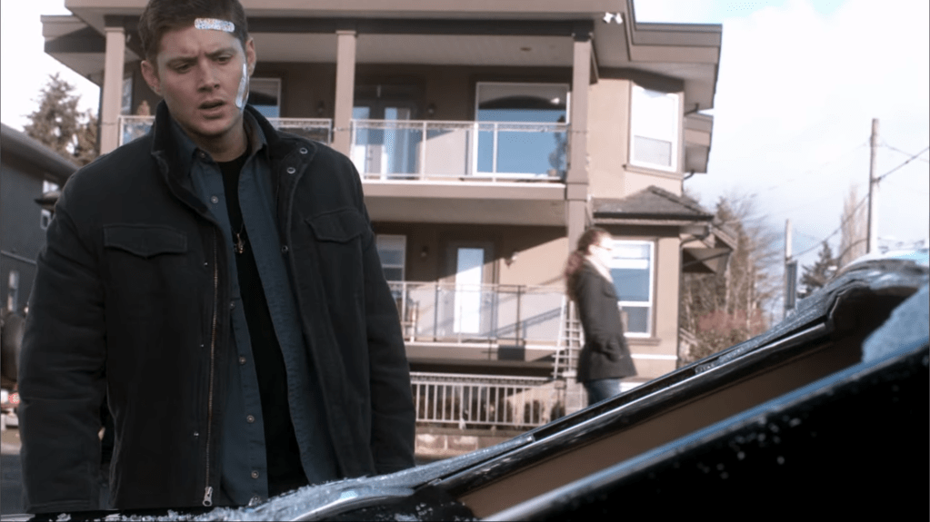 This dilemma, as yet unresolved, leads the brothers to consider what they ought to do with the information they’ve received. In particular, Chuck has a vision of Sam meeting and having sex with the demon Lilith at the Red Motel. Sam is skeptical of Chuck’s visions because he imagines he would never give in to Lilith’s whims, and plus, even the little details of the story seem particularly far-fetched: for instance, it recounts Dean having pink band-aids on his face and driving around with a tarp on the Impala’s back window, things he would never do. Therefore, Sam argues that they should use the chapter to find Lilith and kill her. Dean, proclaiming that Sam is not ready to face her, thinks they should get out of town, and when that doesn’t work (the only route out of town is, of course, blocked), he argues they should use the chapter as a guide for what not to do. But despite their best efforts, things go exactly as written, down to the pink band-aids.